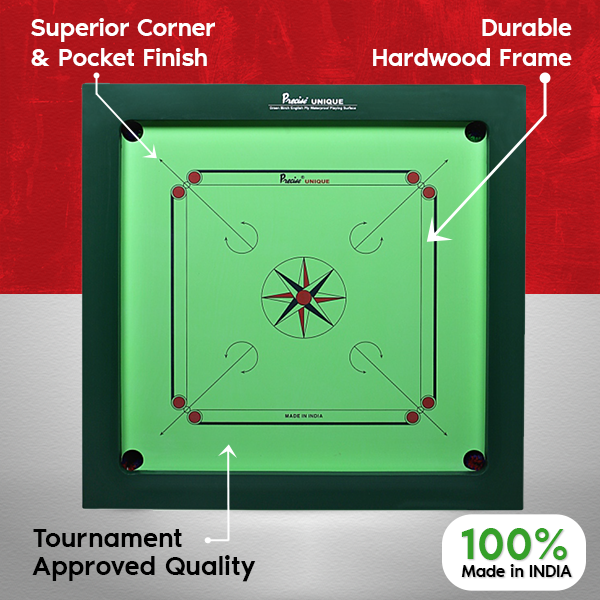 - Similar to Exclusive carrom boards, Unique class of quality means its top playing surface is super satin smooth opaque natural eye cooling green colured coated English Birch Ply playing surface with combination of dark green colored frame.