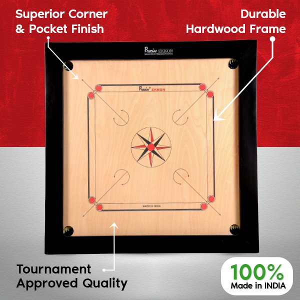 - Precise Ekkon Series carrom boards consist of B grade birch english ply as super satin smooth waterproof/scratch proof flat playing surface.